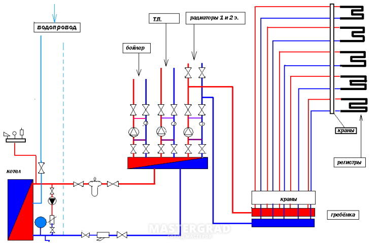 Lors de la première étape, il est nécessaire de procéder à l'installation de collecteurs de distribution, qui sont sélectionnés individuellement pour chaque marque de chaudière. Ensuite, installez les circuits des pompes et assurez leur raccordement à la chaudière. À la fin, effectuez des tests de pression de l'équipement (test de la résistance de son fonctionnement).