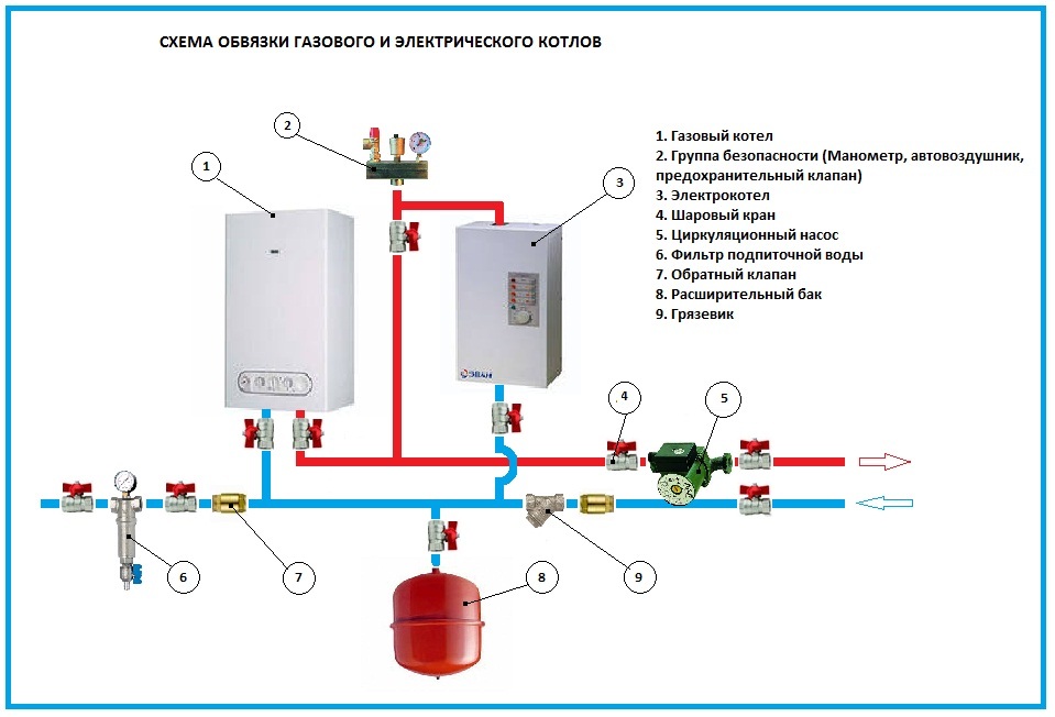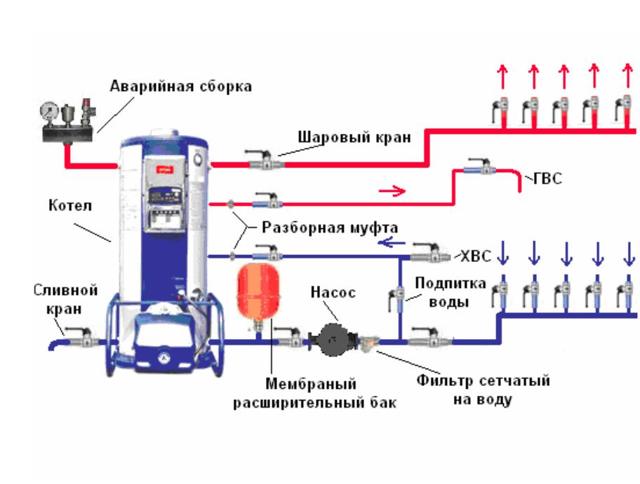 Dans le cas le plus simple, la tuyauterie de la chaudière ne contient que des vannes d'arrêt à l'entrée de la chaudière - afin que des réparations puissent être effectuées si nécessaire. Même sur la canalisation de retour provenant du système de chauffage, ils ont mis un filtre à boue - pour éliminer les éventuels contaminants. C'est tout le harnais.