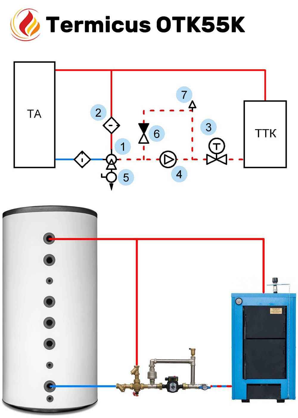 Le schéma présenté montre comment connecter correctement l'unité et doit toujours accompagner toute chaudière à combustible solide, de préférence même à pellets.Vous pouvez trouver n'importe où divers schémas de chauffage généraux - avec un accumulateur de chaleur, une chaudière à chauffage indirect ou une flèche hydraulique, sur lesquels cette unité n'est pas représentée, mais elle doit être là. Plus d'informations à ce sujet dans la vidéo :