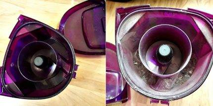 Le nettoyage du filtre principal en fibre de verre lui-même mérite également l'attention. Directement dans le dépoussiéreur, vous devez tourner plusieurs fois la poignée d'un mécanisme spécial, qui fait sortir la poussière du filtre et qui se retrouve dans le récipient. Ensuite, videz-le - comme d'habitude.