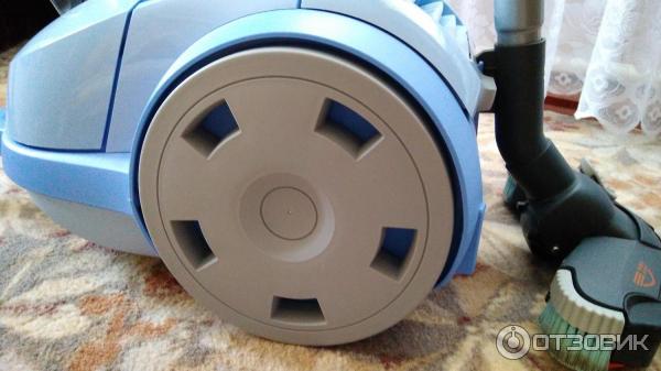 L'aspirateur est fabriqué dans un design moderne et original avec des lignes douces, sans angles vifs. L'appareil est maniable grâce à l'exécution réussie du système de roue. Il comprend 2 grandes roues et 1 petite. Ils sont fabriqués en plastique durable et équipés d'une bordure en caoutchouc.
