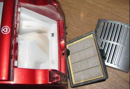 Le premier mécanisme de filtrage peut supporter 2 à 3 cycles de nettoyage. Habituellement, après eux, beaucoup de poussière s'accumule dans le matériau, ses performances diminuent, l'aspirateur aspire beaucoup plus faible. Pour éviter de tels problèmes, vous devez laver régulièrement le filtre à l'eau courante.