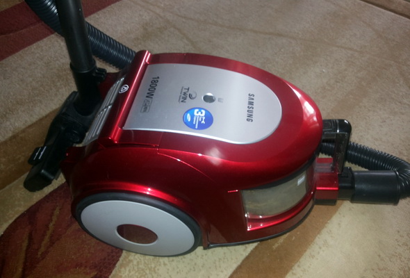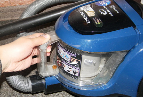 Parfois, certaines lacunes inhérentes à ce modèle Samsung sont également indiquées. Le principal problème est que vous devez utiliser la poignée du conteneur pour transporter l'appareil horizontalement. Si en même temps, appuyez accidentellement sur le bouton de déverrouillage, l'aspirateur tombera, ce qui peut causer des dommages.