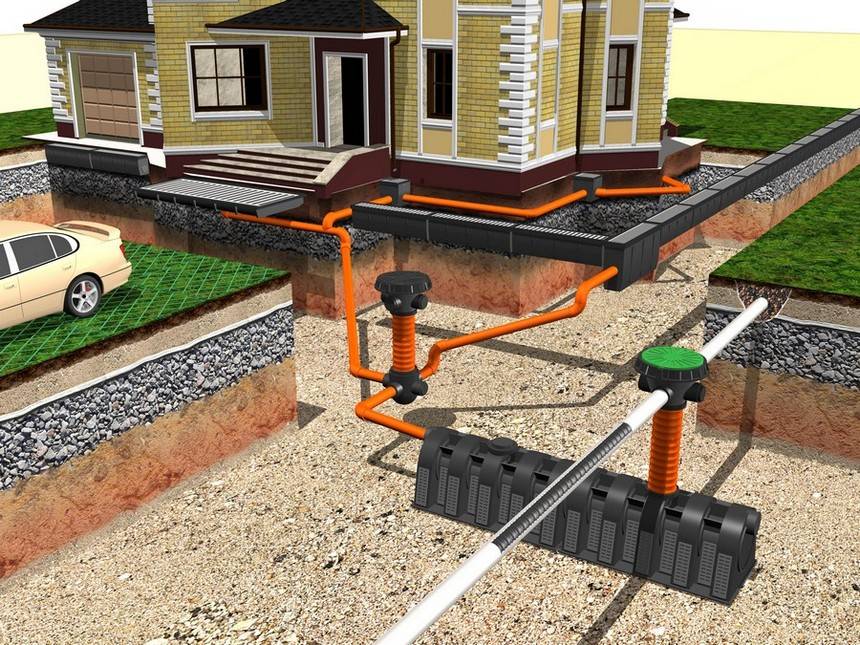 La direction des canaux et des canalisations est stricte - vers les installations de captage ou les fossés situés en dehors du territoire de la parcelle personnelle. Dans cette direction, des tuyaux de drainage sont posés avec une pente nécessaire à la libre circulation des eaux souterraines collectées par les drains vers les installations de déchargement.