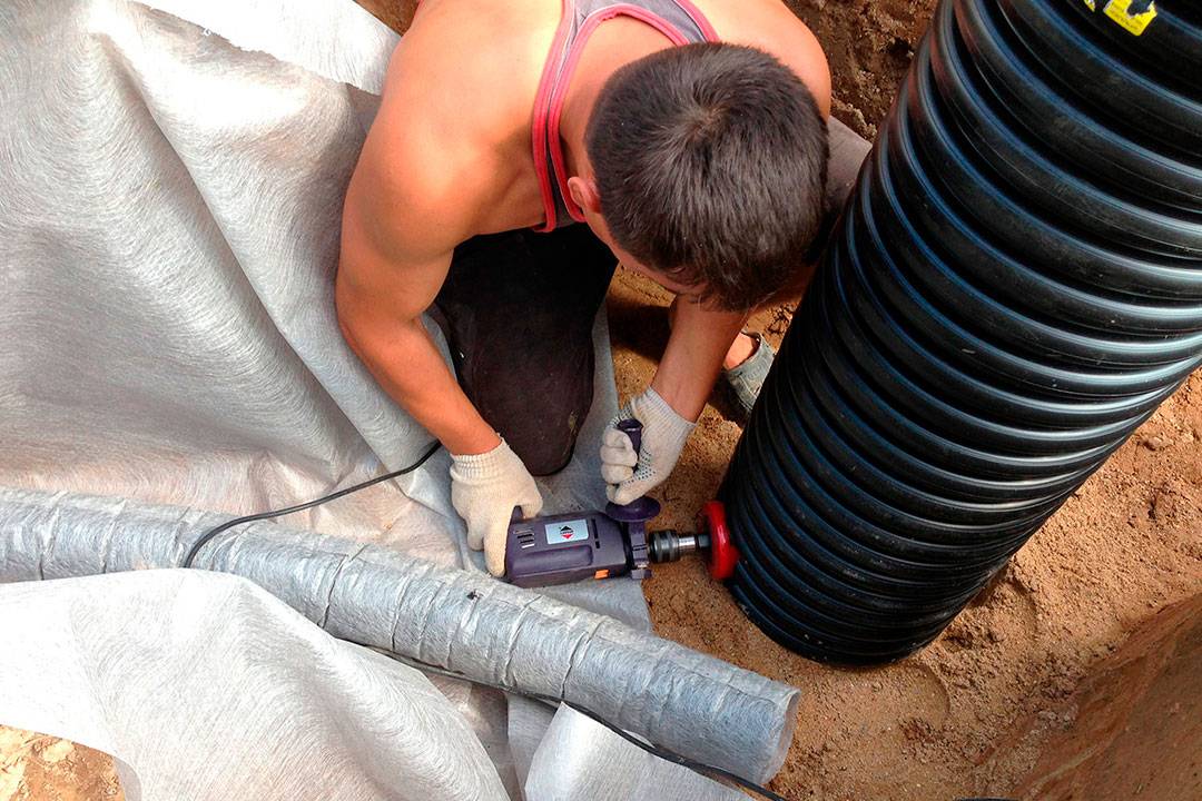 - Il est nécessaire d'installer une barrière sur les blocs, pour cela, vous pouvez prendre des géotextiles ou du carton de parement. Pour les buses finies, cette étape est ignorée, car elles sont déjà enveloppées dans un matériau spécial.