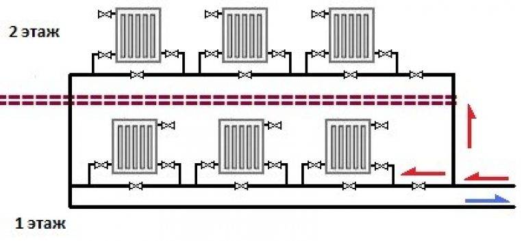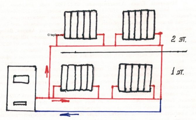 Le principal inconvénient d'un tel schéma: aux étages inférieurs de la maison, le liquide de refroidissement a une température bien inférieure à celle des étages supérieurs.