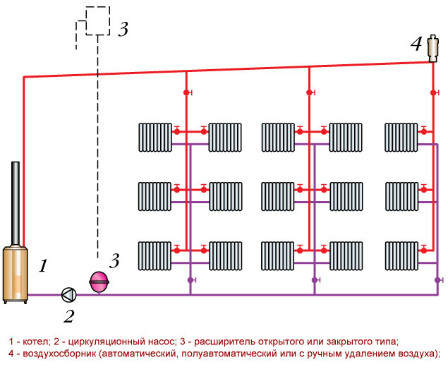 Le schéma de câblage vertical fonctionne beaucoup plus efficacement si une pompe de circulation y est incluse. La circulation forcée du liquide de refroidissement permettra, même avec un plus petit diamètre de la canalisation principale, d'obtenir un chauffage assez rapide.