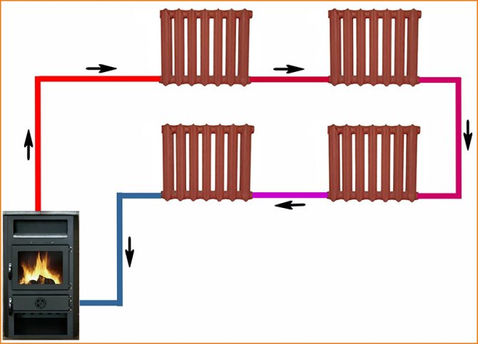 • Avec le mouvement inverse. Comme son nom l'indique, l'eau d'un circuit rectiligne se déplace dans ce cas dans le sens opposé à celui par lequel l'eau réfrigérée retourne à la chaudière. Une caractéristique de ce type est la présence d'une "impasse" - le radiateur final, dans lequel les points les plus éloignés des deux circuits sont reliés.