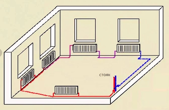 Avec câblage horizontal le nombre minimum de tuyaux est utilisé et les appareils sont connectés en série. Mais cette méthode de connexion est caractérisée par la congestion de l'air et il n'y a aucune possibilité de réguler le flux de chaleur.