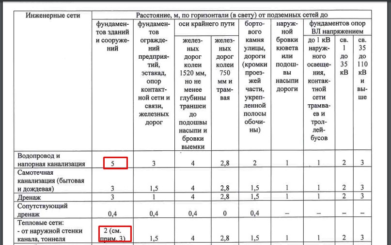 Même dans la coentreprise, vous pouvez trouver un tableau réglementant les distances minimales entre les services publics. Distances entre l'approvisionnement en eau et les égouts, les câbles électriques et les réseaux de chauffage, entre les égouts pluviaux et domestiques, etc.