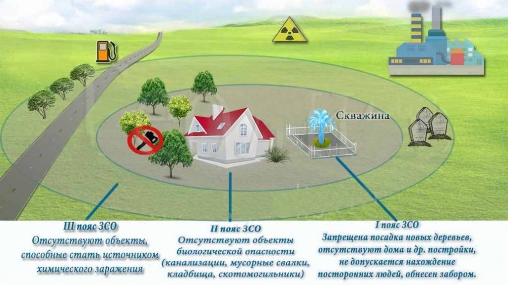 L'essence des calculs est que diverses pollutions avec précipitations peuvent pénétrer profondément dans la terre et atteindre l'aquifère. Ainsi, la distance est déterminée pour que ces pollutions n'atteignent pas cette nappe de prise d'eau. En fait, cela sera déterminé par le temps nécessaire à l'eau à l'intérieur du réservoir pour s'auto-purifier. Par exemple, si des contaminants pénètrent dans l'aquifère 500 m avant le puits, lorsqu'ils l'atteignent, ils doivent être nettoyés indépendamment sous l'influence de facteurs naturels. Les eaux souterraines ont cette propriété. Cela est particulièrement vrai pour l'activité des micro-organismes. Ceux-ci, étant dans l'eau pendant une longue période, meurent ou deviennent incapables d'agir sur le corps humain.