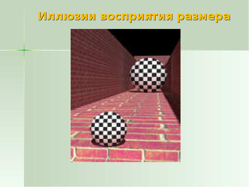 Par exemple, l'illusion de deux balles. On voit vraiment que la boule éloignée est beaucoup plus grosse que la boule proche. Mais ce sont les mêmes. L'illusion se produit en raison d'une erreur dans le cerveau, car il est certain que plus l'objet est éloigné, plus il est petit.
