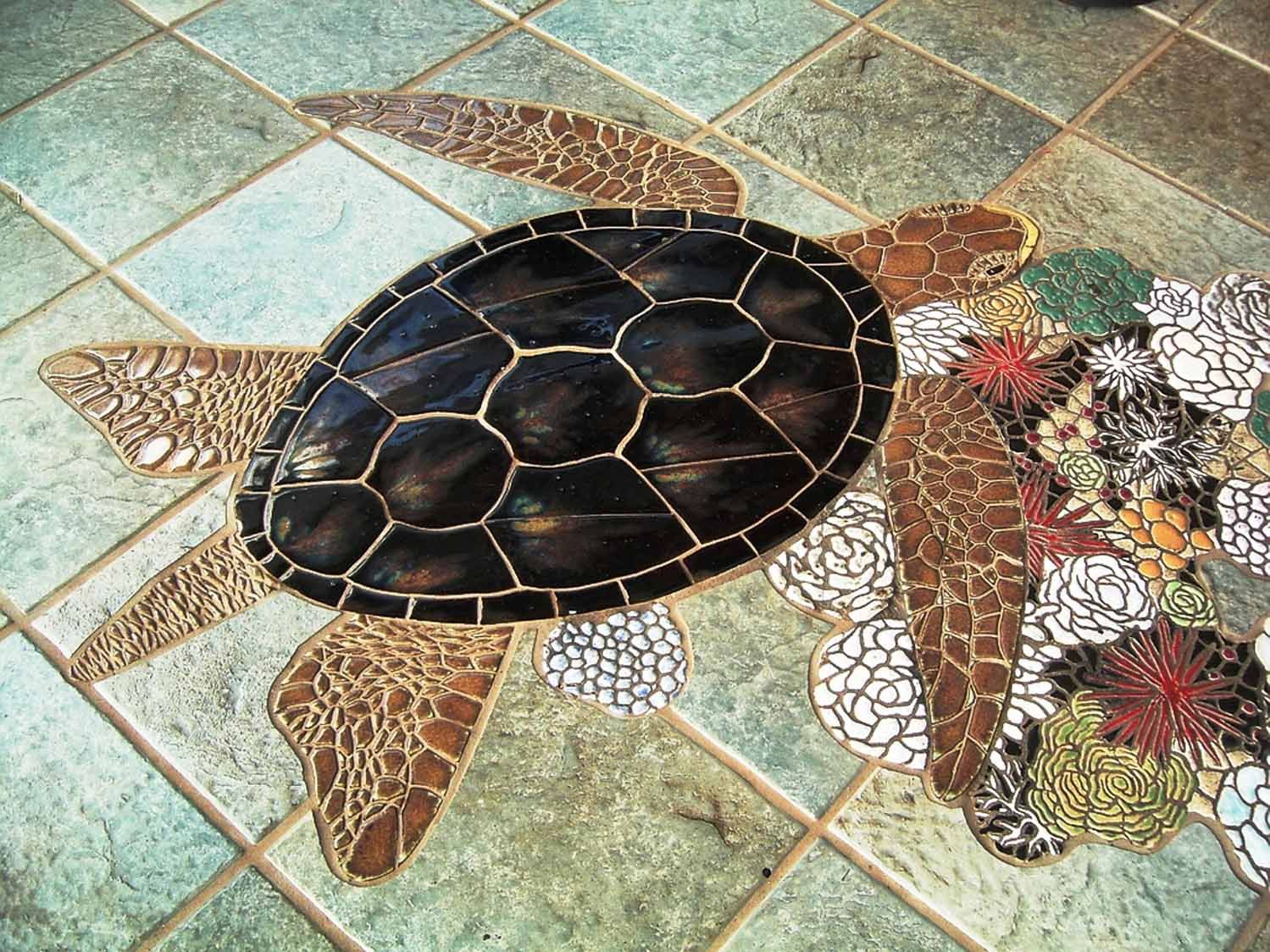 - surface. Le colorant sec est frotté sur la surface des modules encore humides ou peint avec une solution à l'aide d'un aérographe. La méthode donne une couleur vive, mais demande beaucoup de travail. De plus, au fur et à mesure de l'abrasion et de l'écaillage, le carreau perd sa couleur ;