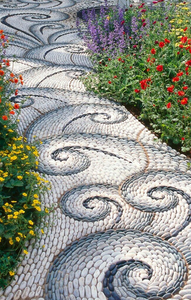 Ces chemins inhabituels servent de cadre digne pour les plantes de jardin en fleurs.