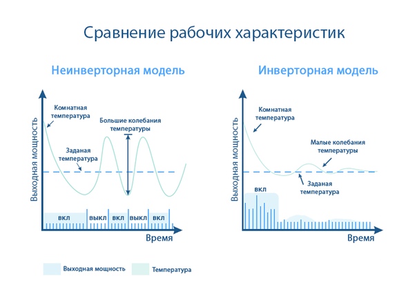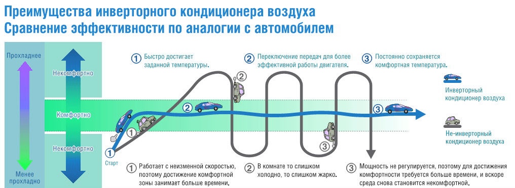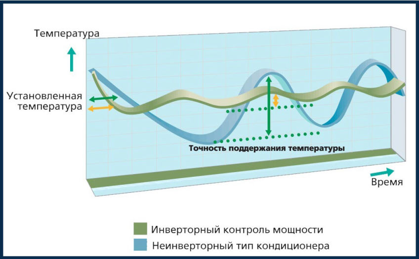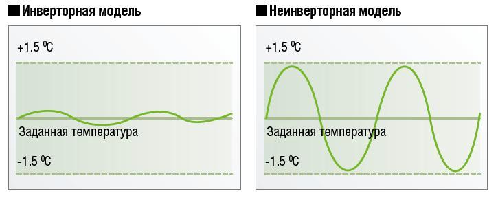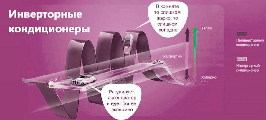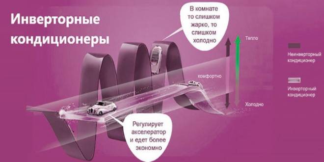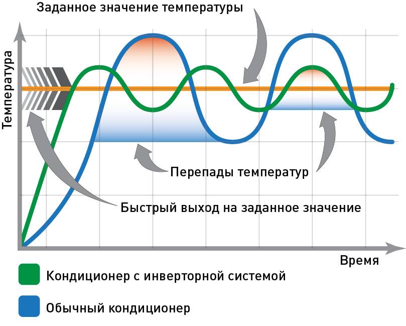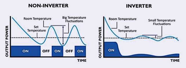 Un simple climatiseur, comme mentionné ci-dessus, fonctionne de toutes ses forces et, après avoir atteint la valeur de thermomètre appropriée, il s'éteint. Le processus cyclique de réglage de la température d'un climatiseur simple a ses propres caractéristiques. Tout d'abord, trouver la température au niveau souhaité est extrêmement incohérent. En raison de la fin de la scission, les indicateurs commencent à changer et le système nouvellement activé est obligé de les rattraper encore et encore. Deuxièmement, pendant le fonctionnement du climatiseur, des surtensions se produisent, ce qui affecte négativement à la fois le fonctionnement de l'unité elle-même et le fonctionnement de l'ensemble du système d'alimentation.