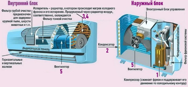 Les climatiseurs Inverter se composent d'une unité intérieure et d'une unité extérieure. Le premier contient : un ventilateur, un évaporateur, un filtre avec un bac dans lequel s'accumule le condensat, ainsi que les détails des stores. Il est installé à l'intérieur. Dans l'unité extérieure, qui est montée sur la rue, il y a : un compresseur, un filtre fréon, un ventilateur et un condenseur.