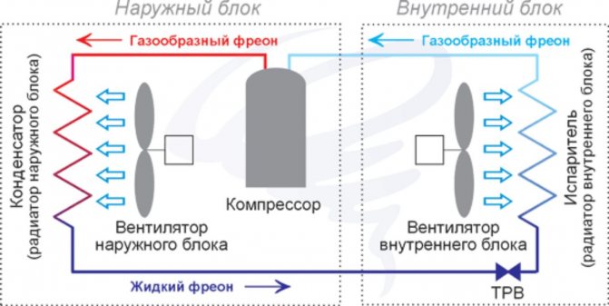 Le principe de fonctionnement est la circulation du fréon de l'évaporateur vers le condenseur et inversement.Le système prélève une grande quantité d'énergie thermique dans la pièce, ce qui est nécessaire pour convertir le fréon en vapeur. Ce processus a lieu dans l'unité intérieure. De plus, à l'aide d'un compresseur, le fréon gazeux est pompé dans l'unité externe, où il acquiert sa forme d'origine.