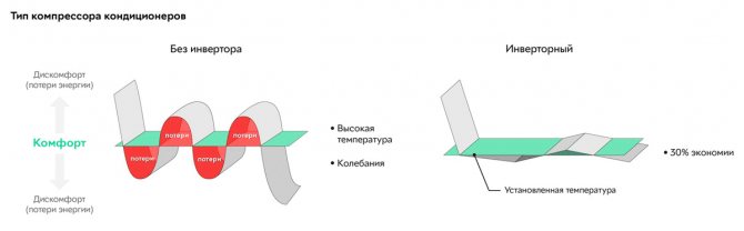 Le nom de climatiseur «onduleur» a été donné en raison du circuit d'alimentation de l'onduleur du compresseur: le courant alternatif est converti en courant continu, puis le courant continu est réduit aux paramètres de tension et de courant requis, après quoi il est à nouveau converti en courant alternatif . Ainsi, le compresseur fonctionne en continu, tout en modulant sa puissance. Les climatiseurs conventionnels refroidissent la pièce à la température souhaitée et s'éteignent. Si après 15 à 20 minutes, la température dans la pièce augmente de quelques degrés, ils se rallument. De tels sauts ont un effet négatif sur le compresseur. Dans les systèmes à onduleur, le chauffage ne s'éteint pas et fonctionne en continu. Lorsque la température ambiante atteint un niveau prédéterminé, le compresseur réduit la capacité et, à mesure que la température augmente, elle augmente. Ainsi, ces appareils peuvent fonctionner à des fluctuations de température de 1-1,5˚С, alors que les habituels sont d'environ 5˚С.