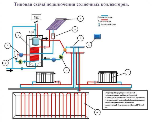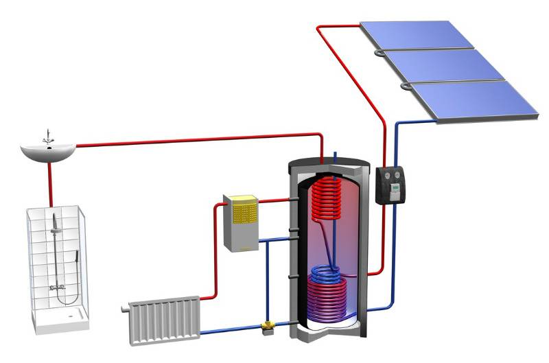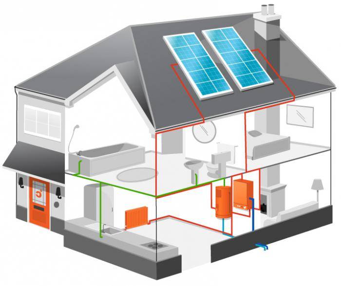 Les systèmes solaires (capteurs solaires) font partie du système de chauffage de la maison. De grandes boîtes calorifugées avec liquide de refroidissement, comme des batteries, sont montées sur des écrans surélevés face au soleil ou aux pentes du toit.