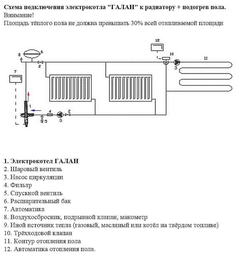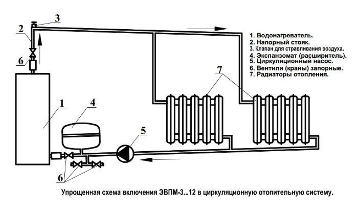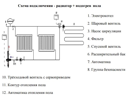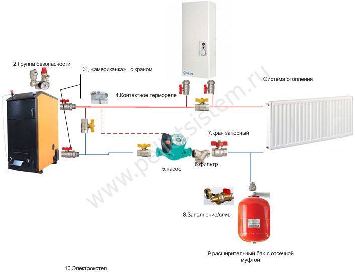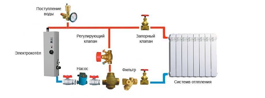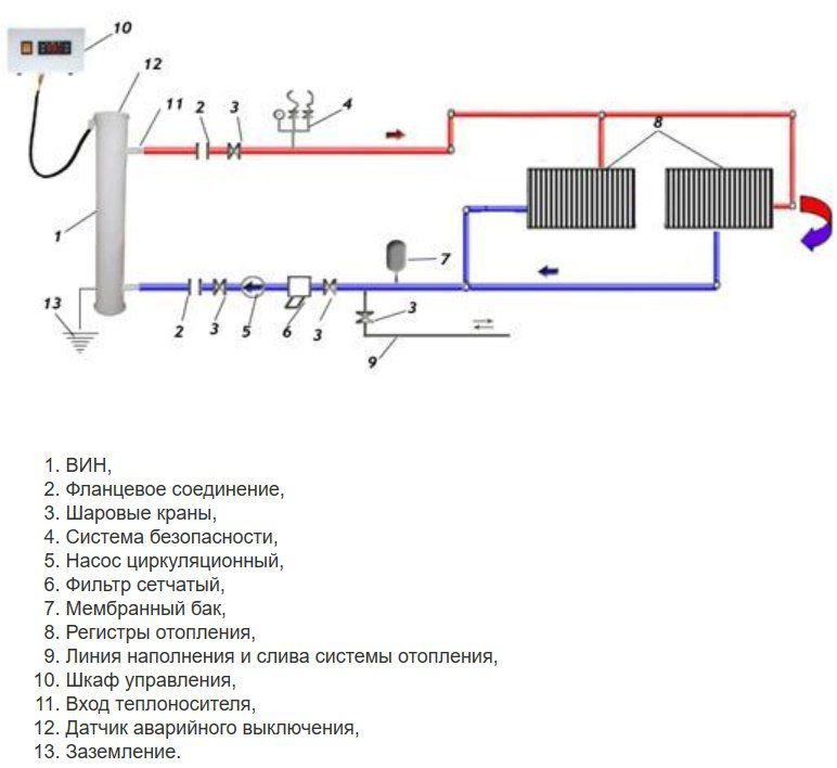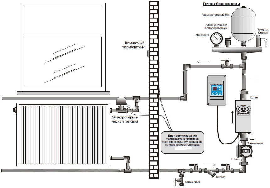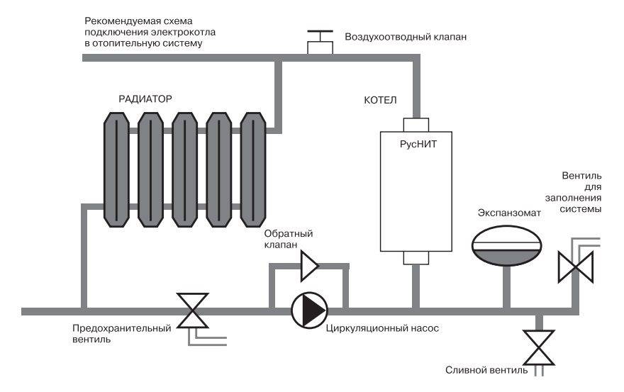 Le schéma de raccordement du chauffage de la chaudière électrique implique qu'un autre compensateur de pression à membrane devra être installé dans un système de chauffage plus volumineux.