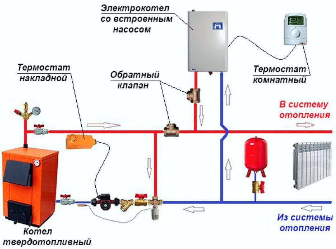 Si vous vivez dans une maison avec un tel système de connexion de deux chaudières de chauffage, une connexion manuelle vous convient parfaitement. La chaudière électrique fonctionnera en cas d'urgence en cas de panne des chaudières pour une raison quelconque. Non seulement arrêté, mais cassé et nécessitant des réparations. Il est également possible de s'allumer automatiquement en fonction de l'heure. La chaudière électrique peut fonctionner en binôme avec du gaz liquéfié et une chaudière solaire au rythme de la nuit. En raison du fait que le tarif de nuit est moins cher pour 1 kW / heure que pour 1 litre de carburant diesel.