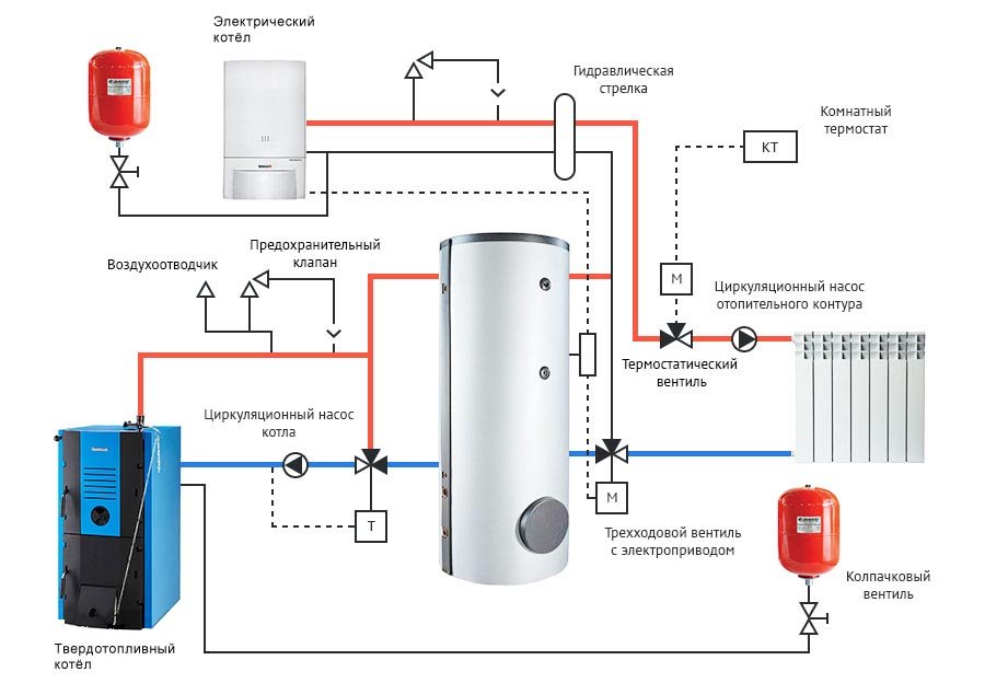 Dans ce cas, un contrôleur et la possibilité d'un contrôle en cascade sont nécessaires.Avec un schéma séquentiel de connexion des chaudières à gaz et à combustibles solides en un seul système, il s'avère, pour ainsi dire, deux circuits indépendants reliés par un accumulateur de chaleur (qu'est-ce qu'un accumulateur de chaleur pour les chaudières de chauffage).