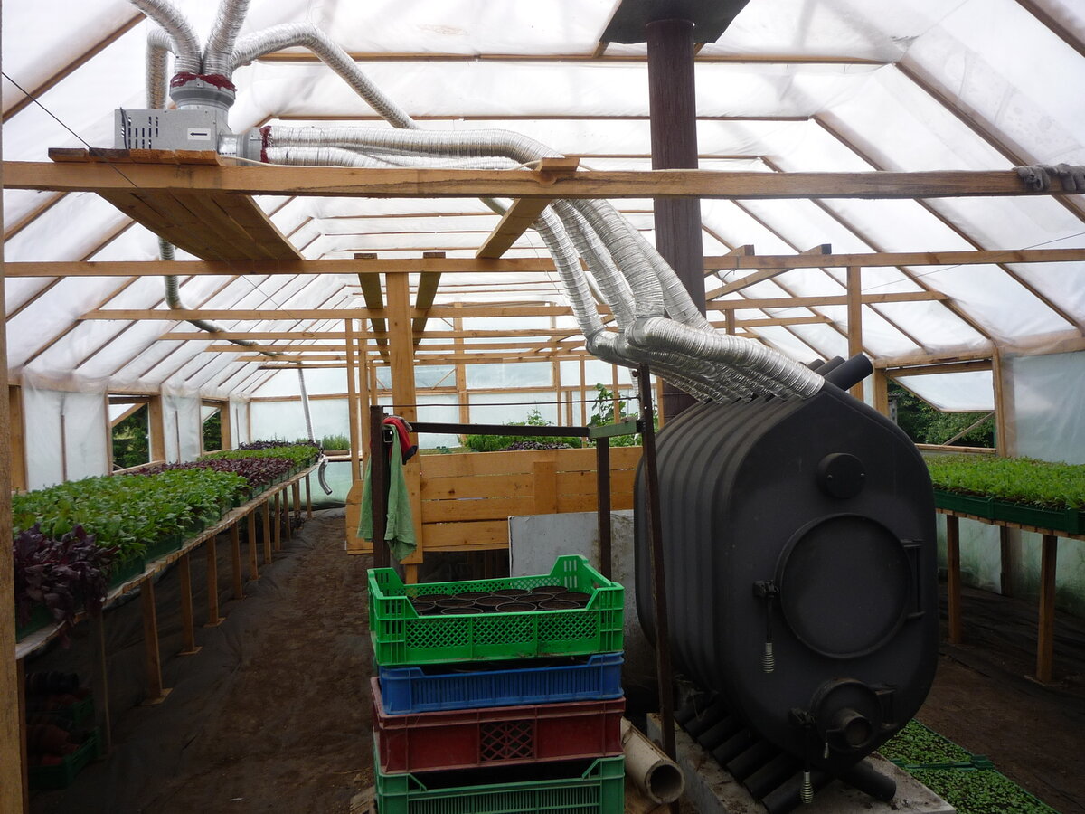 Dans les régions au climat tempéré, l'énergie solaire en hiver ne suffit pas pour réchauffer la serre, vous devez donc recourir au réchauffement de la zone aveugle et à l'installation de radiateurs. Une option économique est un poêle à bois ou un autre combustible. Il est installé sur le côté nord de la serre ou dans le vestibule, toute la zone est chauffée par convection naturelle ou par des conduits d'air posés le long des faîtages. Ils chauffent le poêle le soir et quand la température extérieure baisse.