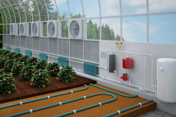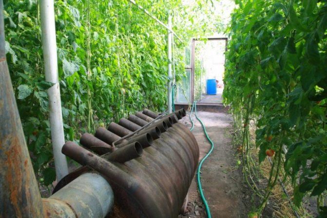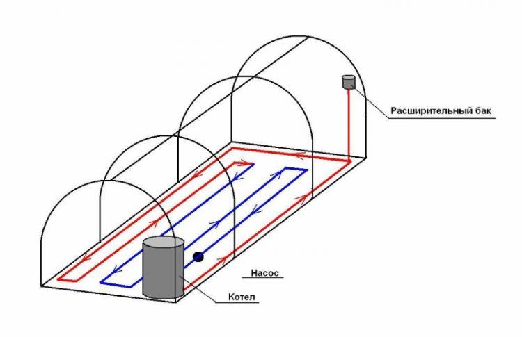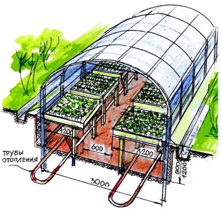 Dans les climats froids en hiver, les heures de clarté sont courtes et le soleil n'affecte pas de manière significative la température dans la serre. Le chauffage doit être continu. Cette tâche est mieux faite circuit de chauffage d'eauposé le long du périmètre de la serre. Il peut être constitué de registres ou de radiateurs reliés par des tuyaux. En même temps, un rideau d'air chaud se crée le long des parois, les plantes ne subissent pas les effets du froid des parois de la serre.