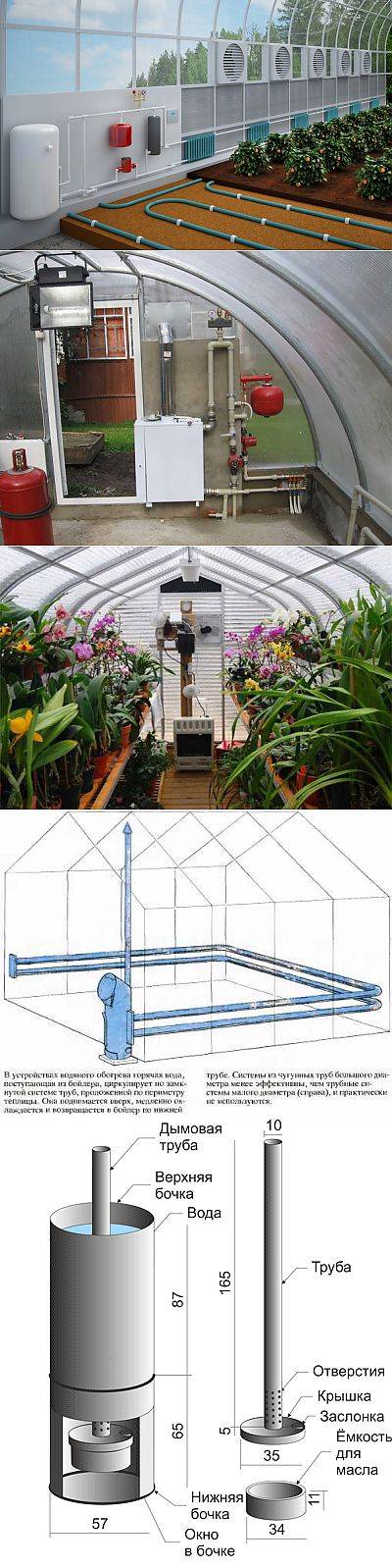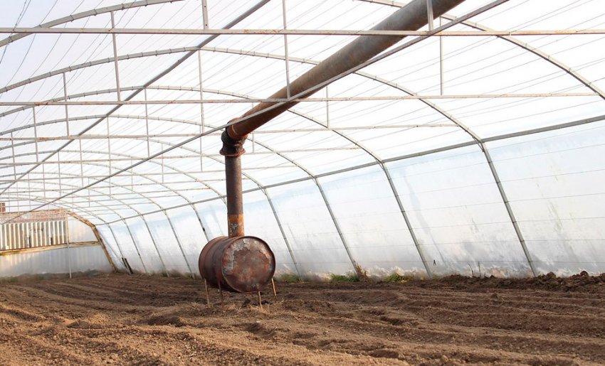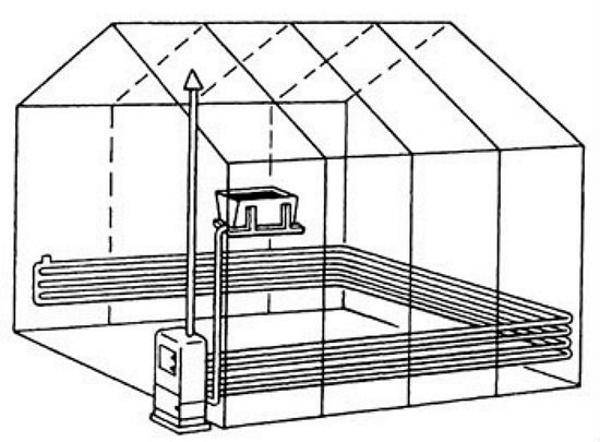- Système de chauffage. Le bâtiment peut être équipé d'appareils de chauffage électriques, dont les meilleurs sont considérés comme une pompe à chaleur, un chauffage par câble, un rayonnement infrarouge, des radiateurs, des convecteurs, un chauffe-eau. Pour les grandes structures, le chauffage au gaz est recommandé.Dans ce cas, une bonne ventilation est nécessaire, car le dioxyde de carbone peut être brûlé. Certains jardiniers expérimentés sur de grandes surfaces utilisent des poêles ordinaires et des matériaux combustibles.