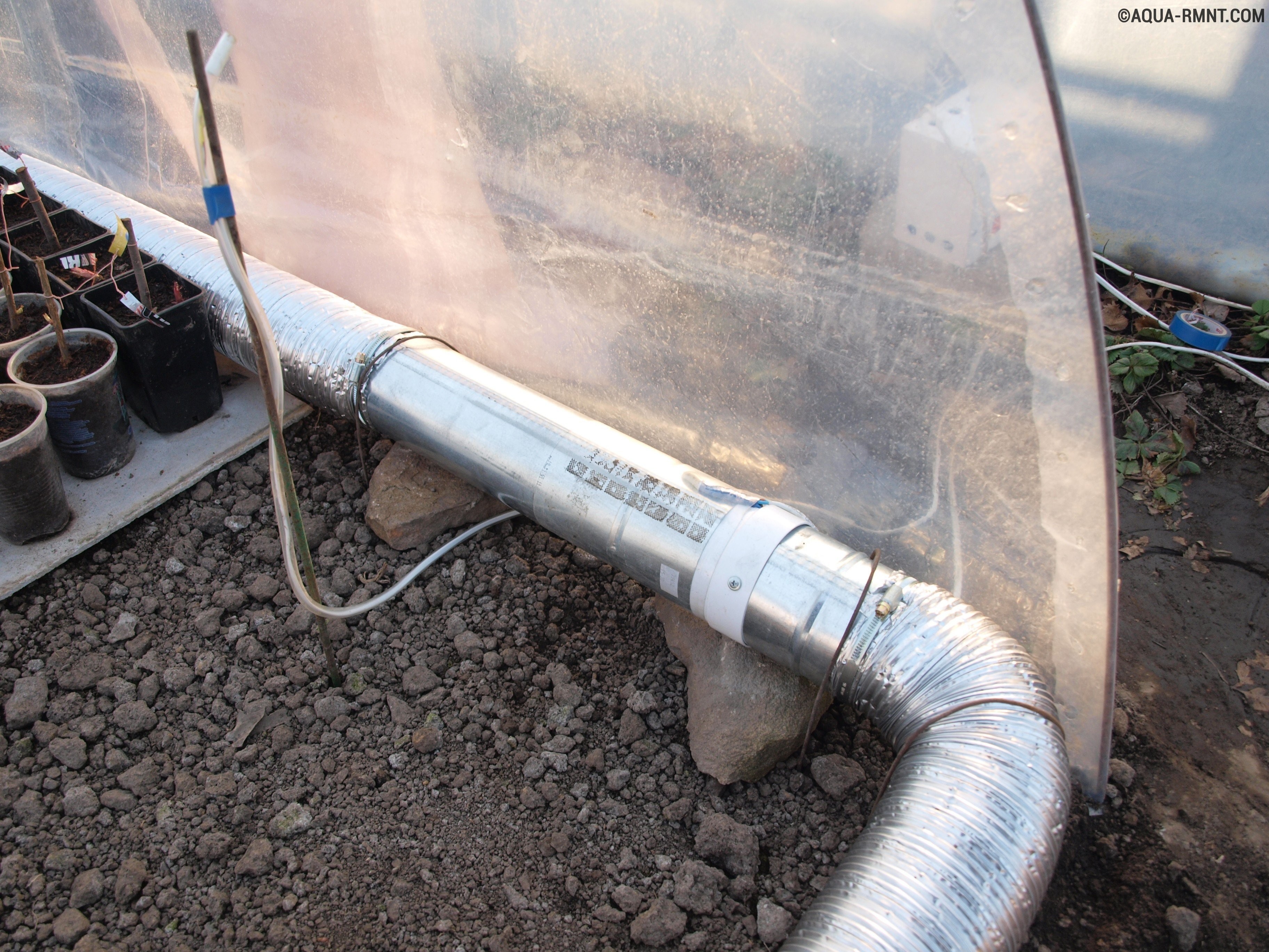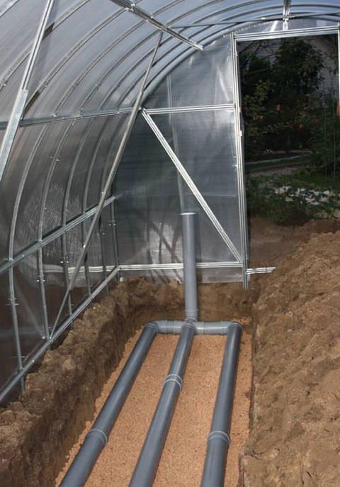 Le chauffage du sol est assuré par de l'air chaud, qui provient de manchons en polyéthylène disposés le long du périmètre de la structure de la serre.