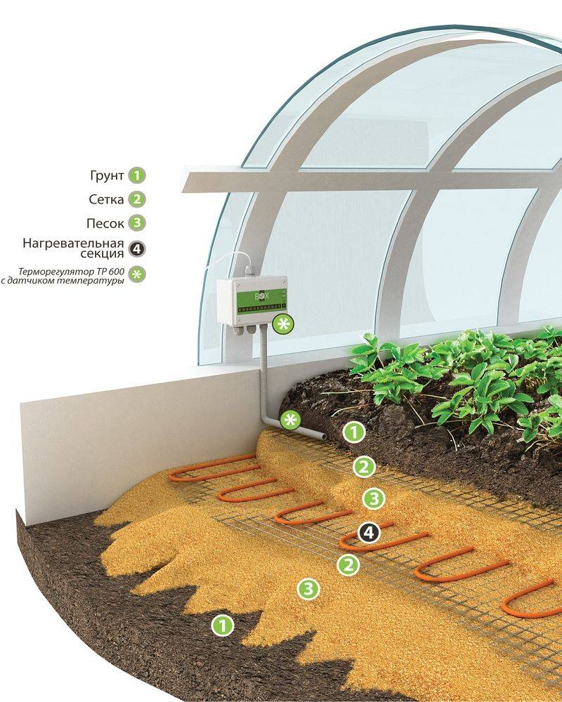 L'utilisation de tapis chauffants ou de câble électrique est une méthode très efficace et peu coûteuse pour chauffer une serre en hiver. Leur principal avantage est la possibilité de pondre dans les zones dont le résident d'été a besoin (à l'extérieur de la serre, entre les rangées, etc.). L'option lorsque les éléments chauffants sont situés directement dans le sol est populaire. Cependant, si vous vous trompez de température, vous pouvez surchauffer le système racinaire des plantes.
