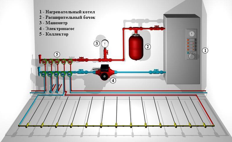 Le caloporteur dans ce cas est de l'eau ou un liquide non gelant, dont la méthode de chauffage peut être différente. Dans certains systèmes, un radiateur électrique tubulaire avec un conducteur interne à haute résistance, appelé chaudière, est intégré, qui chauffe l'eau courante. Le système commence à fonctionner dès qu'il est allumé.