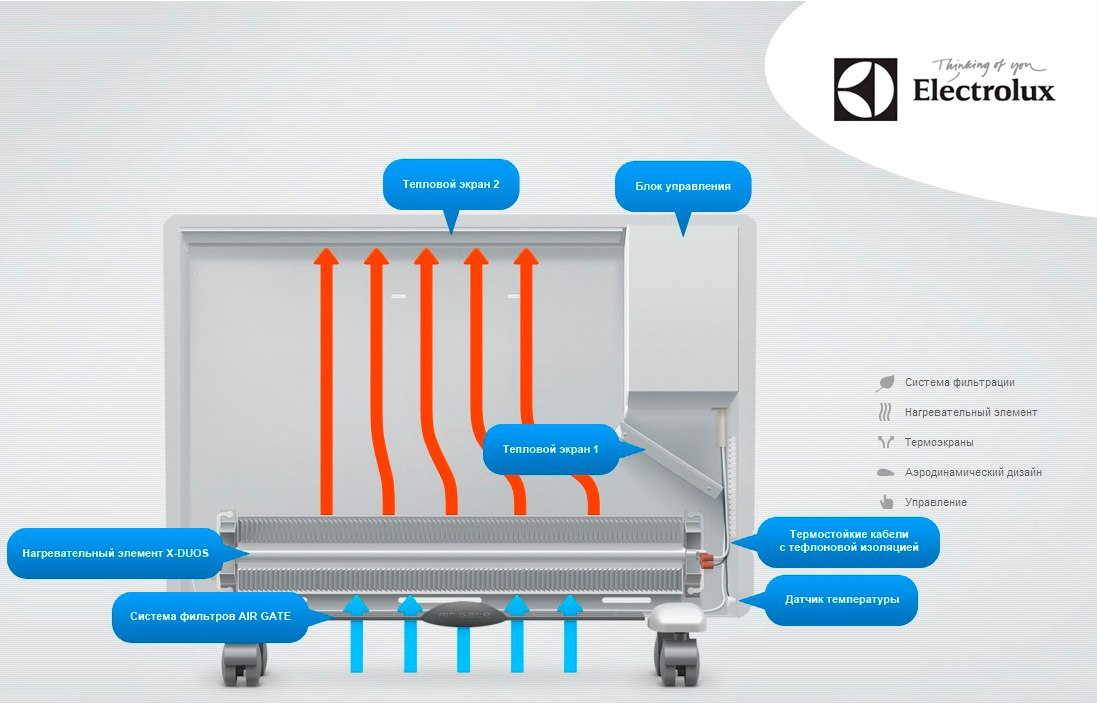 Le fonctionnement de l'unité consiste à faire passer masses d'air froid à travers l'élément chauffant et en augmentant la température. De plus, l'air monte simplement, réchauffant l'atmosphère de la pièce. Certains types d'appareils sont équipés de ventilateurs pour améliorer la circulation de l'air dans la pièce et accélérer le processus de chauffage.