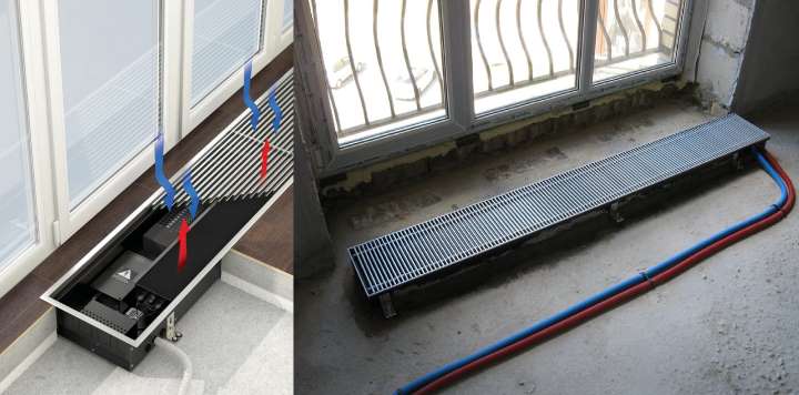 Convecteurs au sol pour le chauffage Les maisons ont généralement une faible puissance, mais en raison de leur emplacement bas, elles chauffent l'air de la pièce plus rapidement. Ils se déplacent bien dans différentes parties de la pièce.