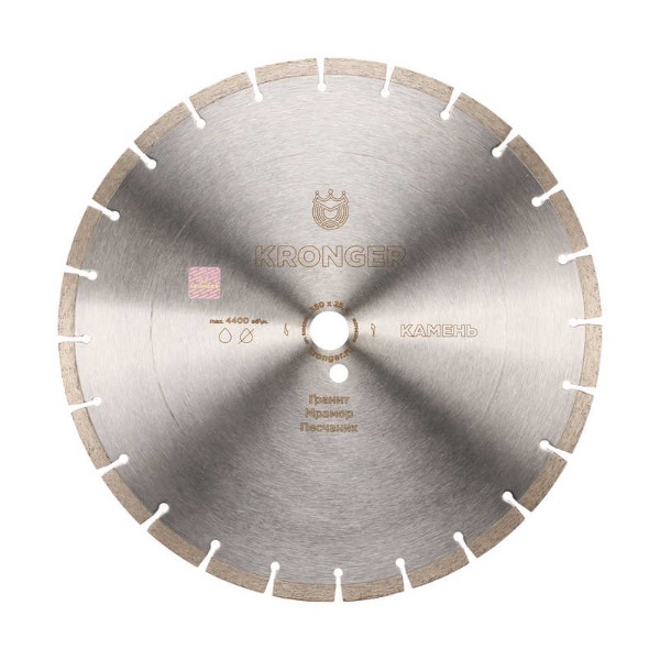 Les disques de coupe sont un corps rond en acier à haute résistance (la base de l'équipement), le long duquel un tranchant en diamants synthétiques avec un liant métallique est soudé. Le cercle est renforcé au centre pour un meilleur équilibre à des vitesses de coupe élevées. Le sens de rotation lors de la coupe est indiqué par une flèche en fonction de l'outillage.