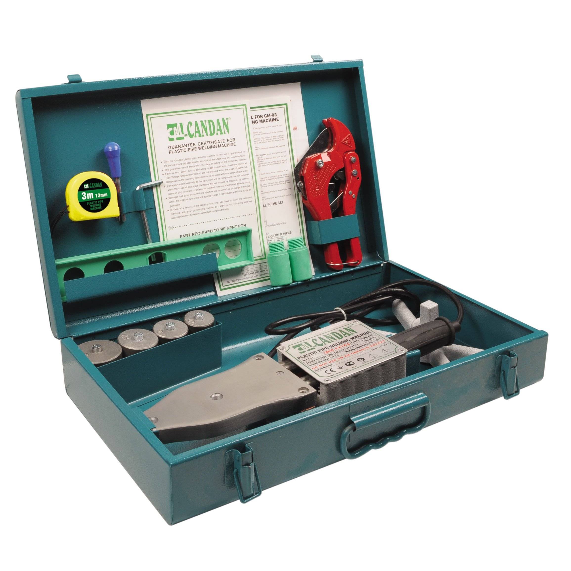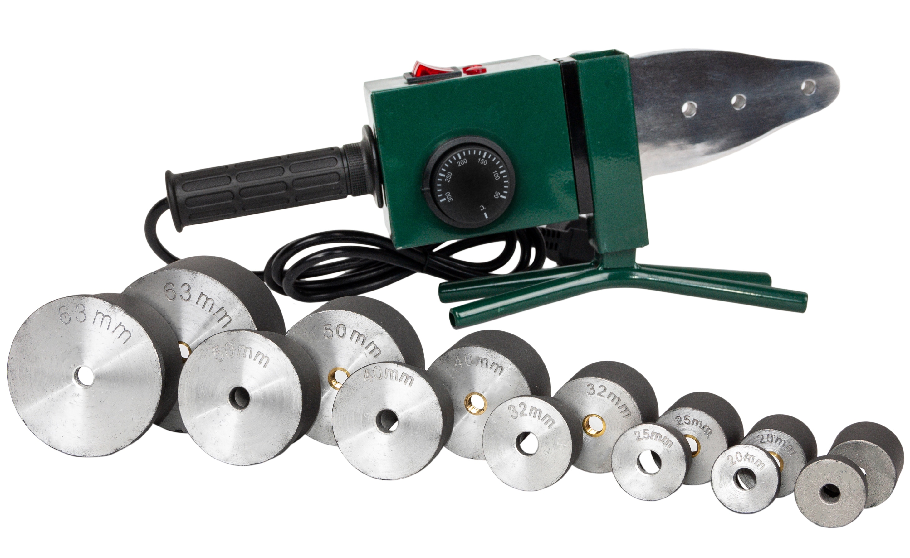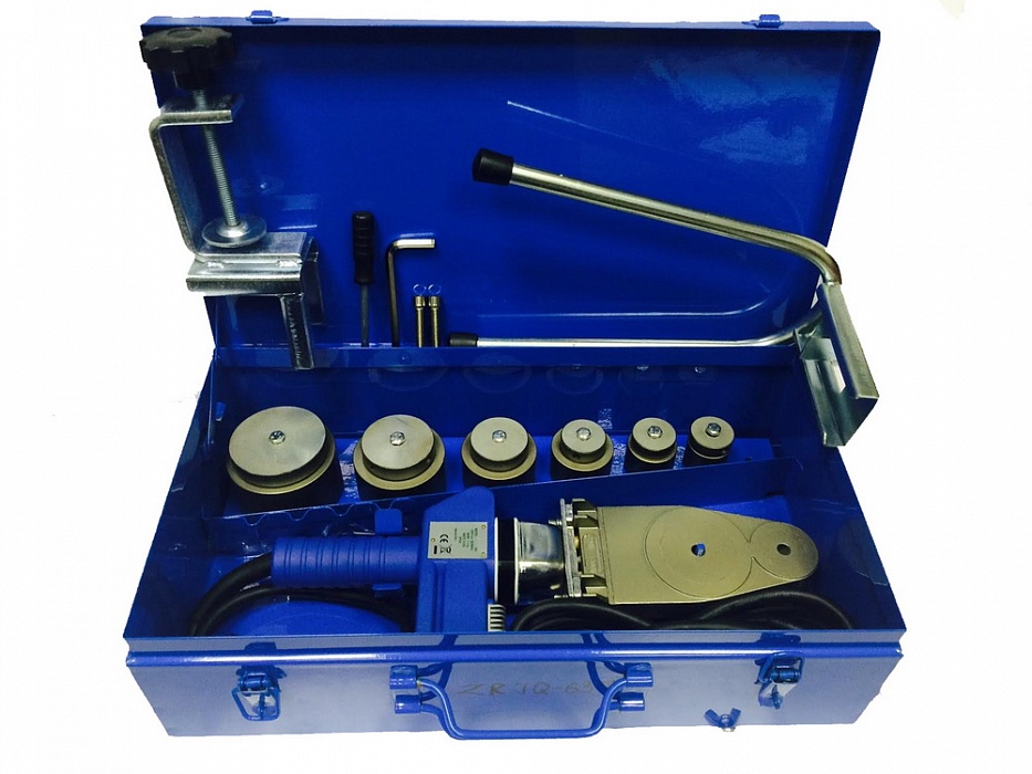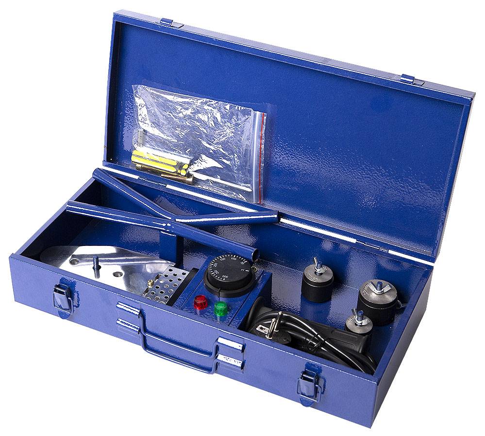 Avec ce kit, vous pouvez travailler avec des tuyaux en polypropylène d'un diamètre de 20 mm à 63 mm. Les têtes de tailles appropriées sont revêtues pour prolonger leur durée de vie. La puissance maximale du fer à souder est de 1 kW.