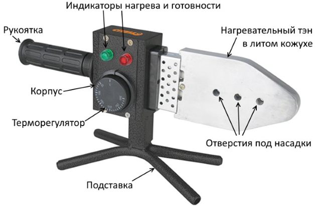 C'est un appareil de chauffage alimenté par un réseau électrique de 220 V. Un fer à souder pour le soudage de tuyaux a une partie active caractéristique, en forme de semelle d'un appareil électroménager que les ménagères utilisent pour repasser les vêtements, c'est pourquoi les professionnels l'appellent un fer à souder pour tuyaux. . À l'intérieur, l'appareil comporte un ou plusieurs éléments chauffants qui créent la température nécessaire pour faire fondre le plastique. Des deux côtés, l'unité est équipée de matrices - buses de différents diamètres.