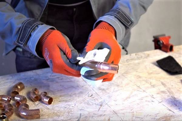 Tout d'abord, vous devez préparer le flux, car il nettoie le métal des oxydes et protège le site de soudure de l'accès à l'oxygène. Flux traite l'extrémité du tuyau et la pièce de raccordement, en l'occurrence un raccord.