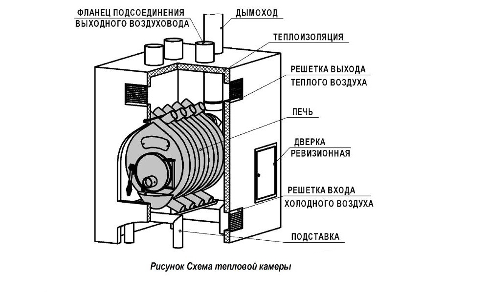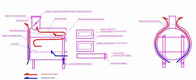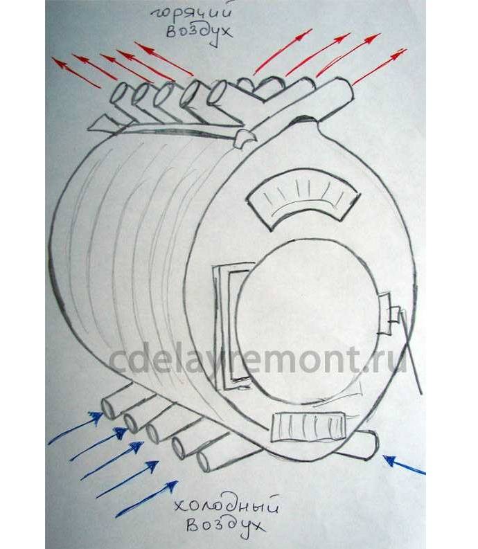 Le four de l'unité de chauffage est un cylindre métallique, des deux côtés duquel sont découpés à intervalles réguliers des échangeurs de chaleur métalliques tubulaires, pliés en forme de genoux. Du fait que les deux tiers du diamètre des tuyaux sont encastrés dans le corps de la fournaise et se trouvent dans la zone de combustion, l'air reçoit jusqu'à 70 % de la chaleur dégagée lors de la combustion du bois de chauffage. Les kilocalories restantes chauffent le corps du poêle et sont ensuite également dépensées pour chauffer la pièce. En raison de cette distribution, le corps buleryan ne chauffe généralement qu'à 60-65 ° C, tandis que l'air qui quitte les canaux de convection a une température supérieure à 100 ° C. Je dois dire que c'est la vitesse de chauffage élevée qui assure l'aspiration active des masses d'air froid dans la partie inférieure des échangeurs de chaleur tubulaires et leur éjection par les ouvertures supérieures du réchauffeur.