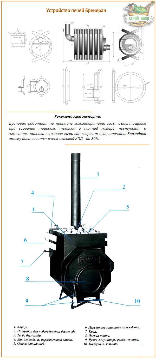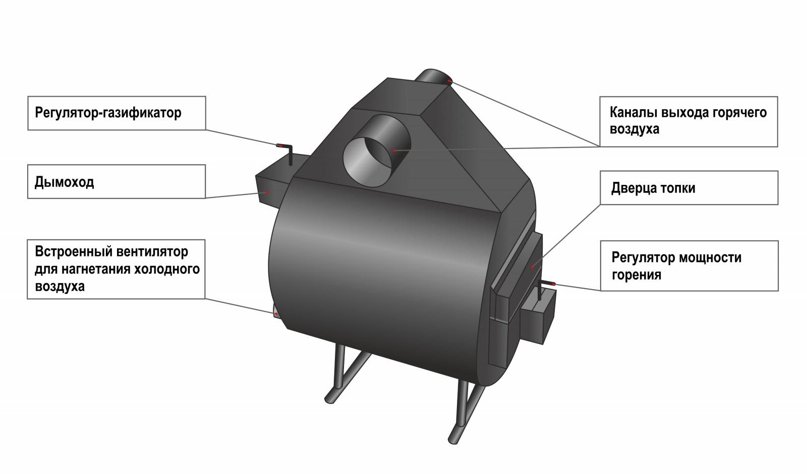 L'ensemble du fonctionnement du four Buleryan repose sur le principe de la convection des flux d'air. Le corps de la structure est en acier sous la forme d'une chaudière, pour laquelle certains appellent le four une chaudière. Épaisseur de 4 à 10 mm et recouvert d'une peinture résistante à la chaleur. Les tuyaux sont pliés aux 2/3 dans le corps, faisant partie du mécanisme principal du four. À l'intérieur du boîtier, il y a une chambre de combustion à deux niveaux, qui n'est protégée par rien et dont le volume dépend directement du volume du cylindre principal. La chambre de combustion est divisée en deux niveaux par une tôle d'acier perforée : inférieure et supérieure.