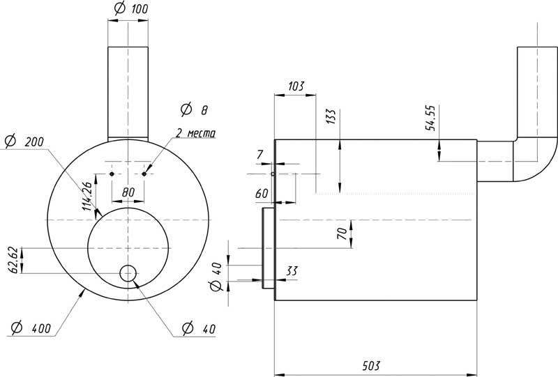 - Possibilité de travaux longs. La configuration de la zone de travail et la conception du ventilateur permettent au buleryan de fonctionner pendant plusieurs heures à partir d'une seule charge de combustible, et le bois de chauffage, les écorces, les copeaux de bois, les copeaux, etc. peuvent être utilisés comme combustible.le boîtier surchauffe et se déforme. En conséquence, la géométrie de l'appareil est déformée, la porte du four ne se ferme pas, des fissures aux endroits des joints soudés.