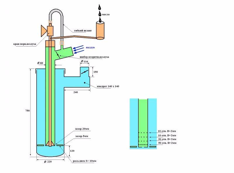 Lors de la fabrication d'une telle chaudière, il est nécessaire de fournir une alimentation en air supplémentaire aux deux chambres de combustion. Un trou est fait dans le réservoir inférieur pour cela - il servira à verser du carburant, ainsi qu'à l'accès à l'air. Pour contrôler l'alimentation en air, le trou est équipé d'un registre. L'air entrera dans la chambre supérieure par de petits trous d'un diamètre d'environ 10 mm. Ils doivent être percés dans le tuyau, d'où les produits de combustion seront fournis à partir de la première chambre, il reliera les deux compartiments.