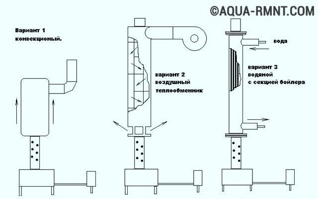 La conception ultérieure n'est pas différente de la conception habituelle: une chaudière à eau est installée, un circuit de chauffage à circulation naturelle ou forcée, des vannes d'arrêt, etc. sont connectés. Une telle option compacte est optimale pour ceux qui ont déjà un four fini et qui souhaitent uniquement l'adapter à la combustion minière.