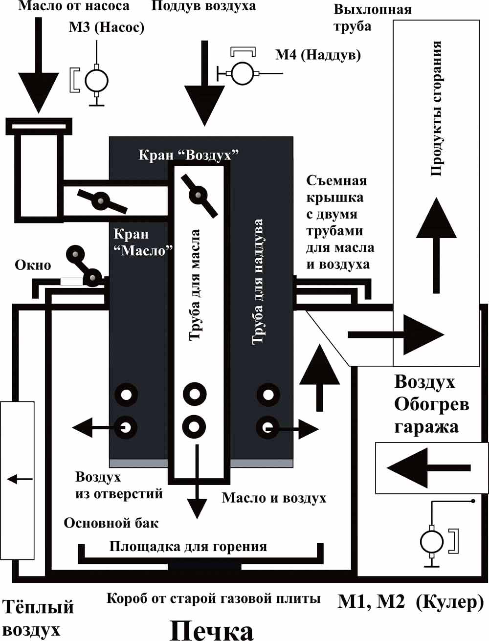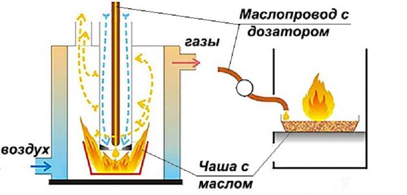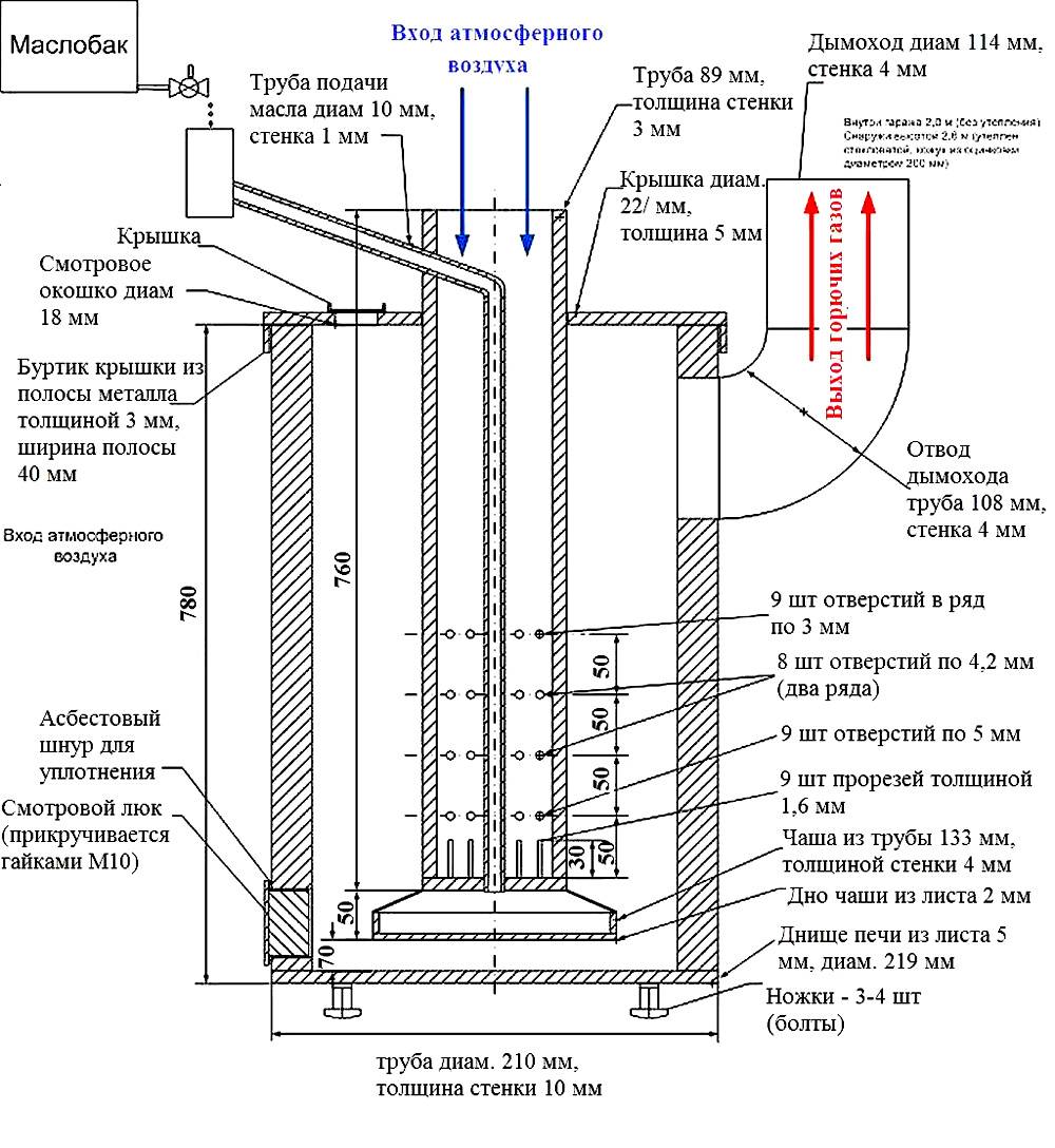 Le principe de fonctionnement du four à huile usée est à peu près le même. Il se compose de deux conteneurs situés l'un au-dessus de l'autre, entre lesquels se trouve une chambre de combustion avec des trous pour l'admission d'air.L'exploitation minière est versée dans le réservoir inférieur, dont les vapeurs brûlent activement dans la chambre médiane, et les produits de combustion, la fumée et d'autres substances pénètrent dans la chambre supérieure reliée à la cheminée, d'où ils sont évacués naturellement.