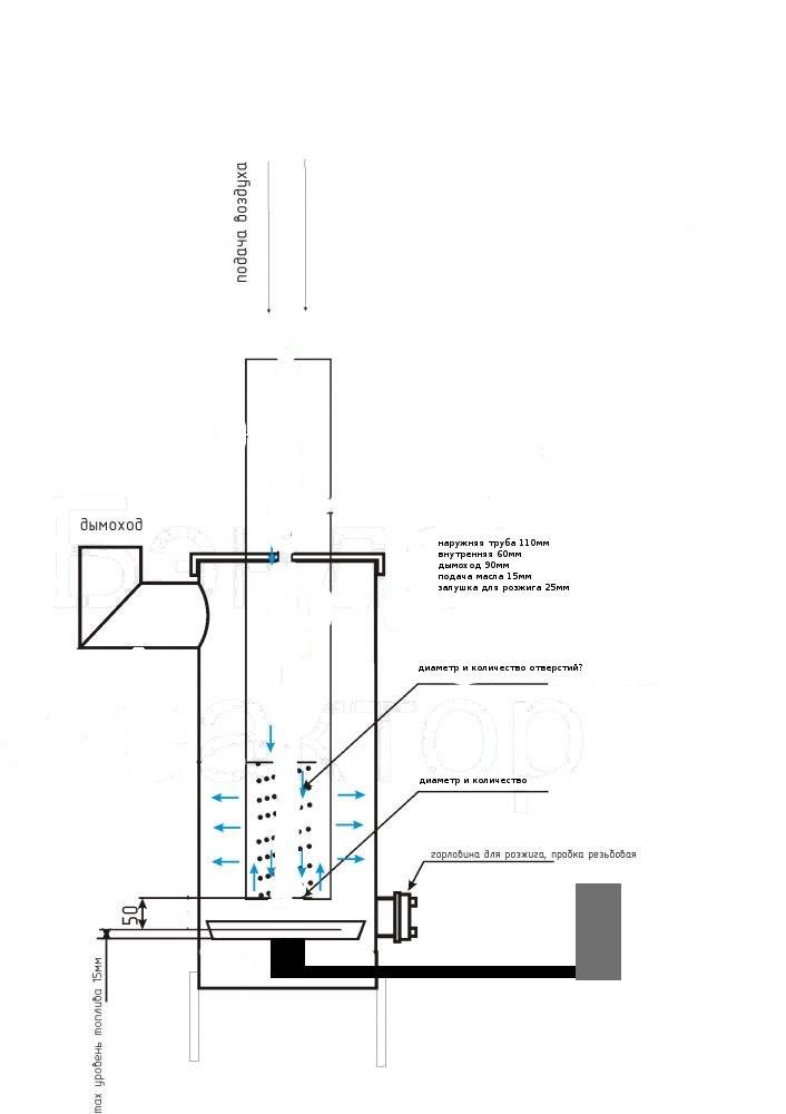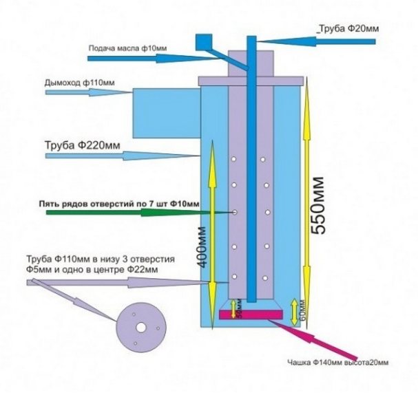De plus, le fond du compartiment supérieur de l'appareil est en tôle d'une épaisseur de 4 mm. Un brûleur est fabriqué à partir d'un morceau de tuyau de 200 mm de long, comme indiqué sur le dessin d'un poêle à mazout. De nombreux trous sont percés autour de la circonférence du produit, qui sont nécessaires pour que l'air pénètre dans le carburant.Ensuite, meulez l'intérieur du brûleur. Cela éliminera la possibilité d'accumulation de suie sur les extrémités et les surfaces inégales.