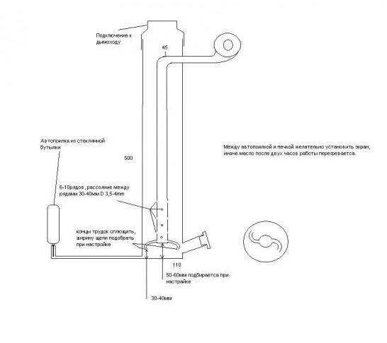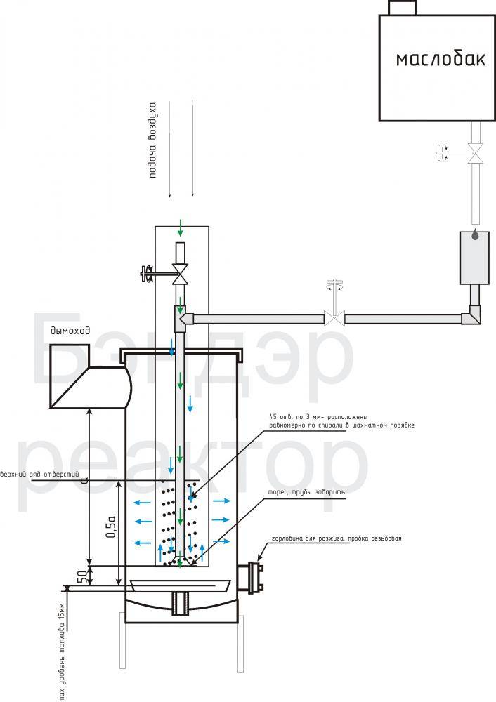 Il sera plus intéressant d'envisager un four à huile usée suralimenté. Il y a aussi suffisamment de dessins, mais la conception est plus complexe et nécessite donc des connaissances supplémentaires dans ce domaine.