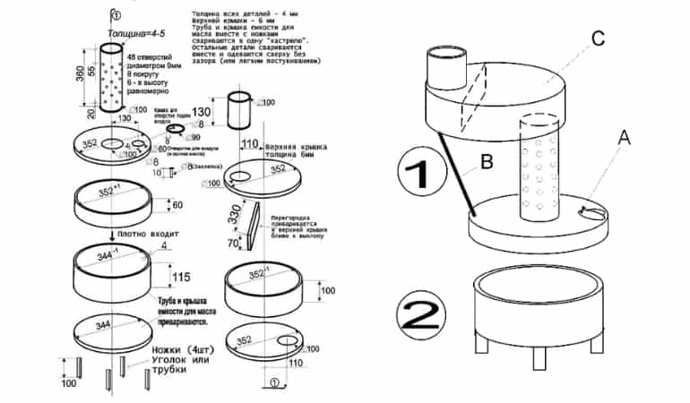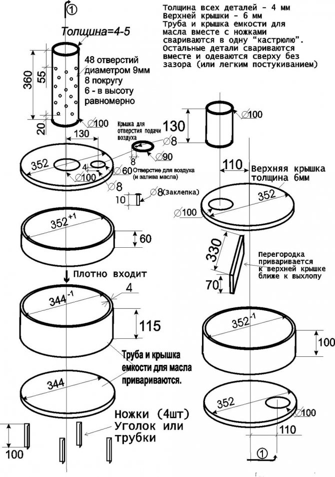 Selon le dessin du poêle, le bac à huile usée est constitué d'un disque de frein automobile en fonte, qui présente de bonnes performances de résistance à la chaleur. Dans sa partie inférieure, un cercle en acier est soudé, qui forme le fond. Un couvercle est réalisé dans la partie supérieure, par l'ouverture duquel l'air pénètre dans le four.