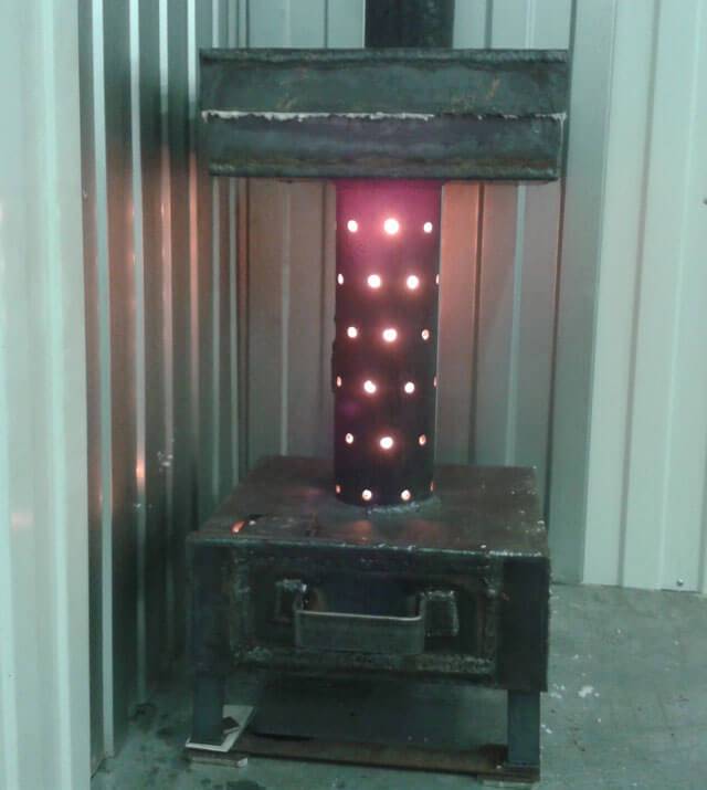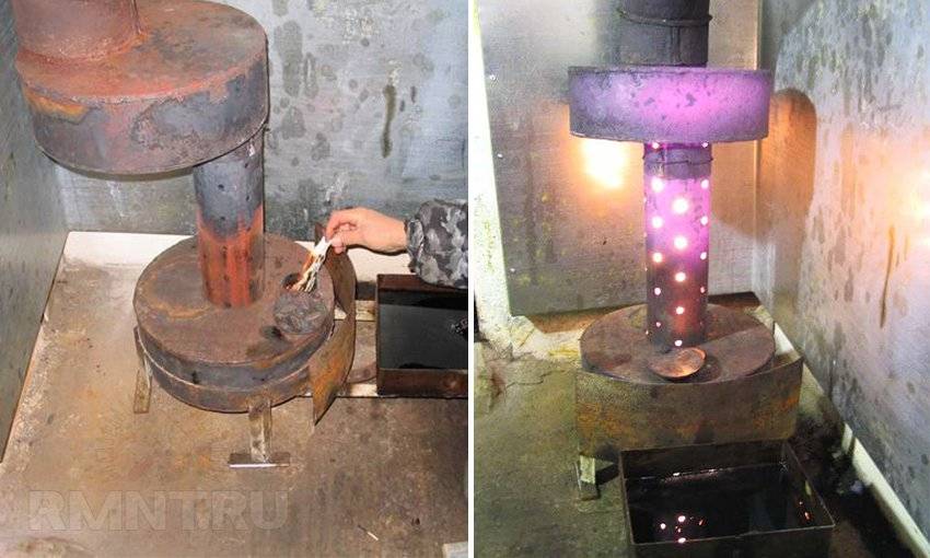 1. La conception la plus simple et la plus populaire de la combustion directe avec post-combustion des vapeurs d'huile dans un tuyau perforé de type ouvert (le soi-disant poêle miracle).