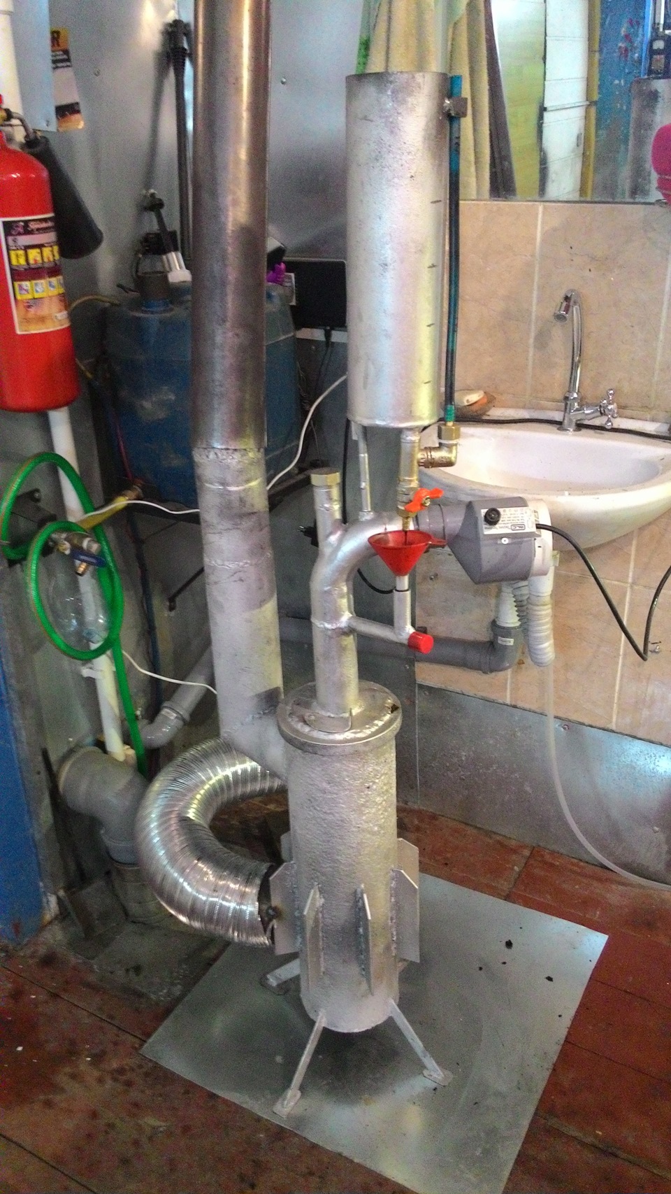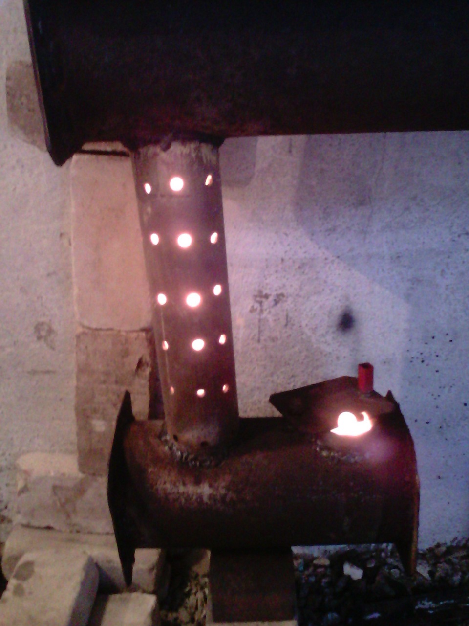 Le foyer à pyrolyse présenté sur la photo est un récipient cylindrique ou carré, rempli au quart d'huile usée ou de gasoil et équipé d'un volet d'air. Un tuyau percé de trous est soudé sur le dessus, à travers lequel l'air secondaire est aspiré en raison du tirage de la cheminée.Encore plus haut se trouve la chambre de postcombustion avec un déflecteur pour évacuer la chaleur des produits de combustion.