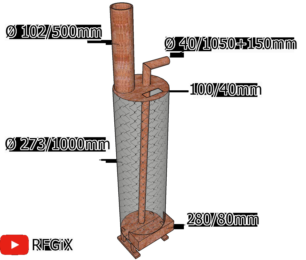 Le foyer à pyrolyse présenté sur la photo est un récipient cylindrique ou carré, rempli au quart d'huile usée ou de gasoil et équipé d'un volet d'air. Un tuyau percé de trous est soudé sur le dessus, à travers lequel l'air secondaire est aspiré en raison du tirage de la cheminée. Encore plus haut se trouve la chambre de postcombustion avec un déflecteur pour évacuer la chaleur des produits de combustion.